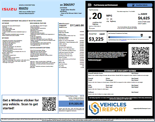 Every Isuzu window sticker by VIN lookup pulls the original factory build information for that specific car, giving you a complete overview of how it was built. Here’s what to expect: